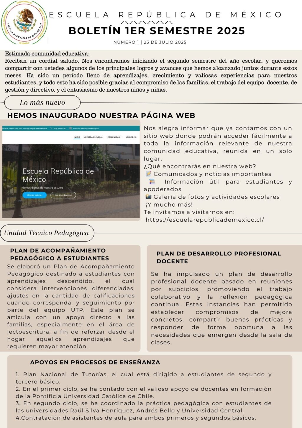 Jueves 5 de junio de 2025 1. Gestión de apoyos Externos Desde la Unidad Técnico-Pedagógica se ha gestionado en conjunto con la dirección de la escuela, la implementación del Plan Nacional de Tutorías, el cual está dirigido a estudiantes de segundo y tercero básico, con un enfoque en el refuerzo de las asignaturas troncales de…